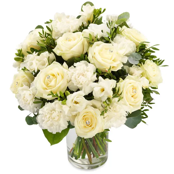 Hvit og grønn er en utsøkt fargekombinasjon. Her møtes de i en vakker og elegant bukett. Leveres sammen med din personlige hilsen. Dette er en gave som gjør varig inntrykk.