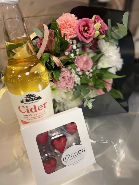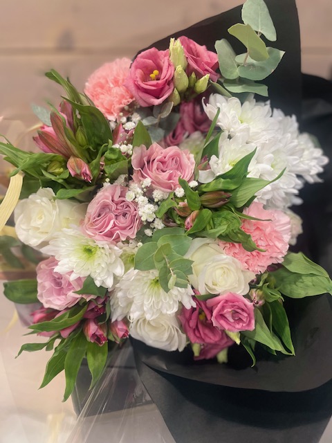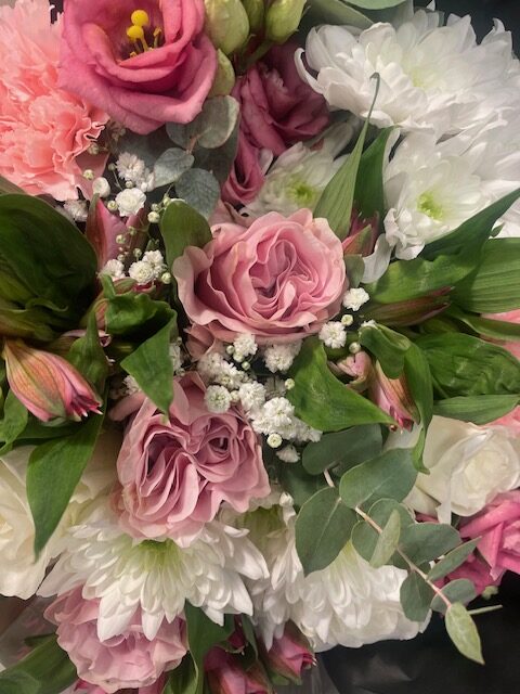 Bukett med hvite og rosa roser, eustoma og voksblomst.