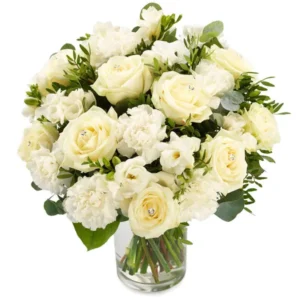 Nydelig dekorasjon i flotte farger. Blomster byttes ut etter sesong og tilgjenglighet.