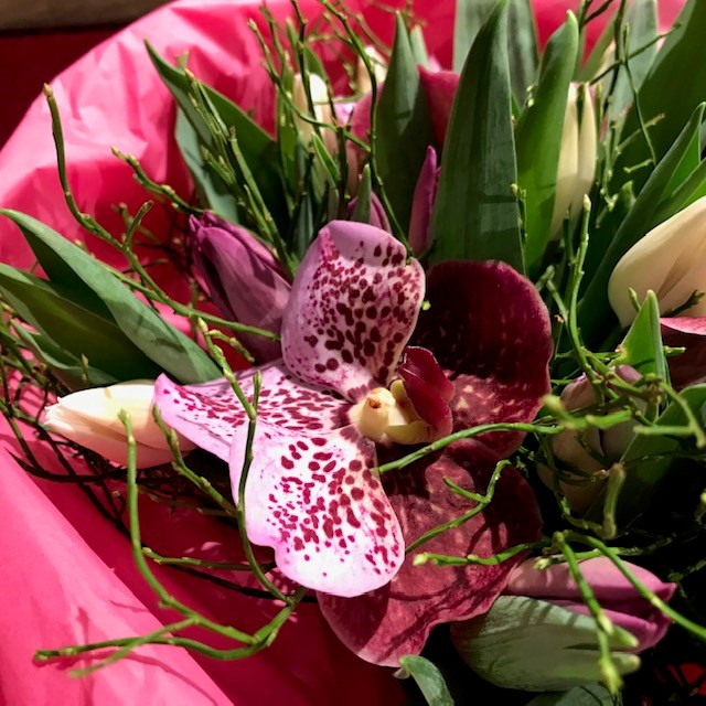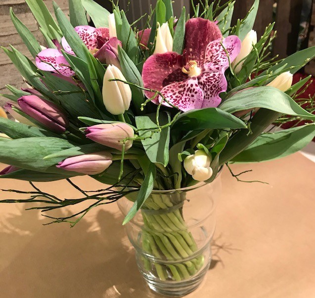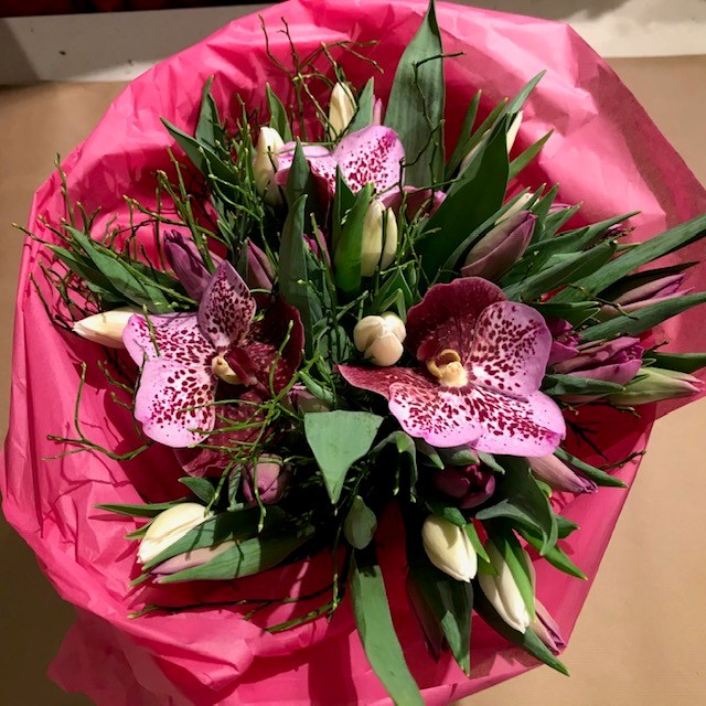 Flotte tulipaner i lilla og hvitt, lilla orkideer og blåbærlyng.