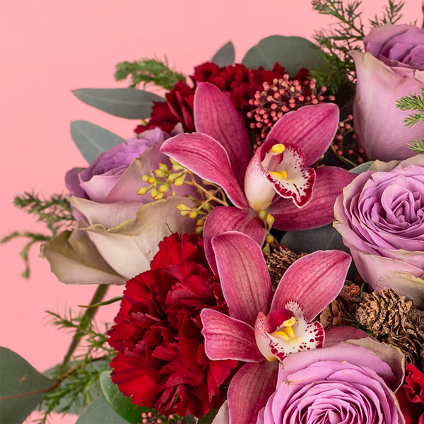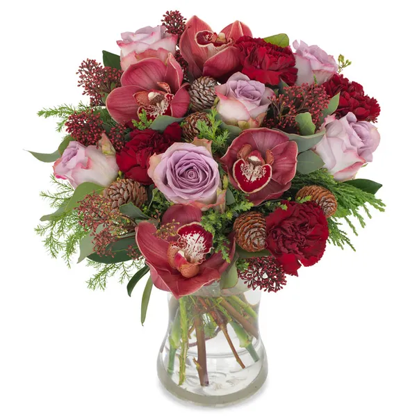 Vakker vinterbukett med blomster som roser, orkideer, nelliker og skimmia sammen med vinterens grønne. Med sine vinrøde og lilla farger blir denne buketten en uforglemmelig overraskelse. Perfekt for alt du ønsker å feire i vinter. Buketten er et eksklusivt blomsterhåndverk, og blomstene er nøye utvalgt for å holde høy kvalitet. Hver bukett er unik og bindes ut fra sortiment og sesong, men beholder alltid sin farge og form.